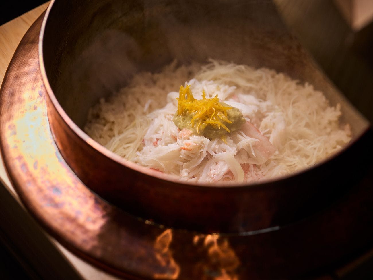 - 一杯一杯違う越前ガニを、塩加減や湯の温度、茹で時間を調整して調理しますので、羽二重(はぶたえ)のようになめらかで上品な茹でガニを食せます。