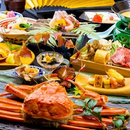 1300年以上の伝統を誇る宿のプランは、絵巻物のような華やかさ。カニ約2杯強を使い。刺し、すき鍋、茄で、焼きガニの王道を中心に、雑炊まで含めて全部で7品もの力二料理が揃う。味のバリエーションもボリュームも申し分なし!